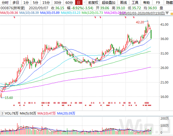 9月7日,农业板块的白马股新希望和海大集团双双跌幅超过8%,两家公司今年以来涨幅均已翻倍,同时新希望大股东近期亦加入减持阵营,新希望9月4日晚间发布公告称,近日公司收到新望投资出具的《关于股份减持计划实施进展的告知函》,截止2020年9月4日,新望投资此次减持计划数量已过半,减持股数487.53万股,减持比例0.11%。