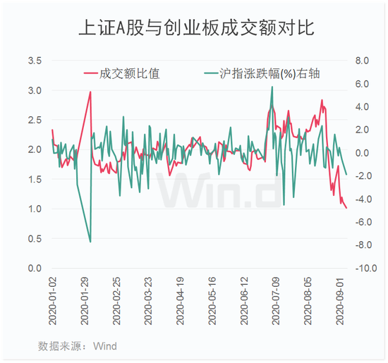 而从今年以来成交额比值与沪指涨跌的关系来看,比值越低沪指走弱的概率也越大,9月7日,创业板成交额创新高的同时,沪指跌幅达1.87%。
