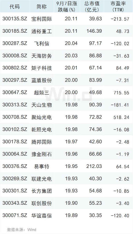 在龙头股的带动下,9月7日,虽然沪深两市大幅下跌,但仍有宝利国际(维权)、通裕重工、飞利信、天海防务、矩子科技、蓝盾股份、超频三、聚灿光电、乾照光电等17家创业板公司涨停。