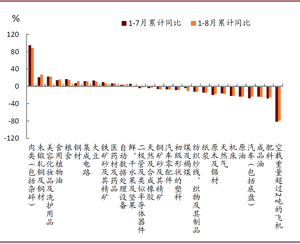 1-8月肉类、鲜干水果及坚果、大豆进口累计增速较1-7月分别收窄5.9、6.7、2.3个百分点。煤炭进口累计增速从1-7月的-4.4%下降至-10.9%,降幅较为明显,这可能与用煤淡季电厂补库存需求弱有关。其他大宗商品(如铁矿石、原油)进口增速较为稳定,但较7月也没有进一步改善,这可能意味着8月国内工业生产缺乏加速扩张的动力。