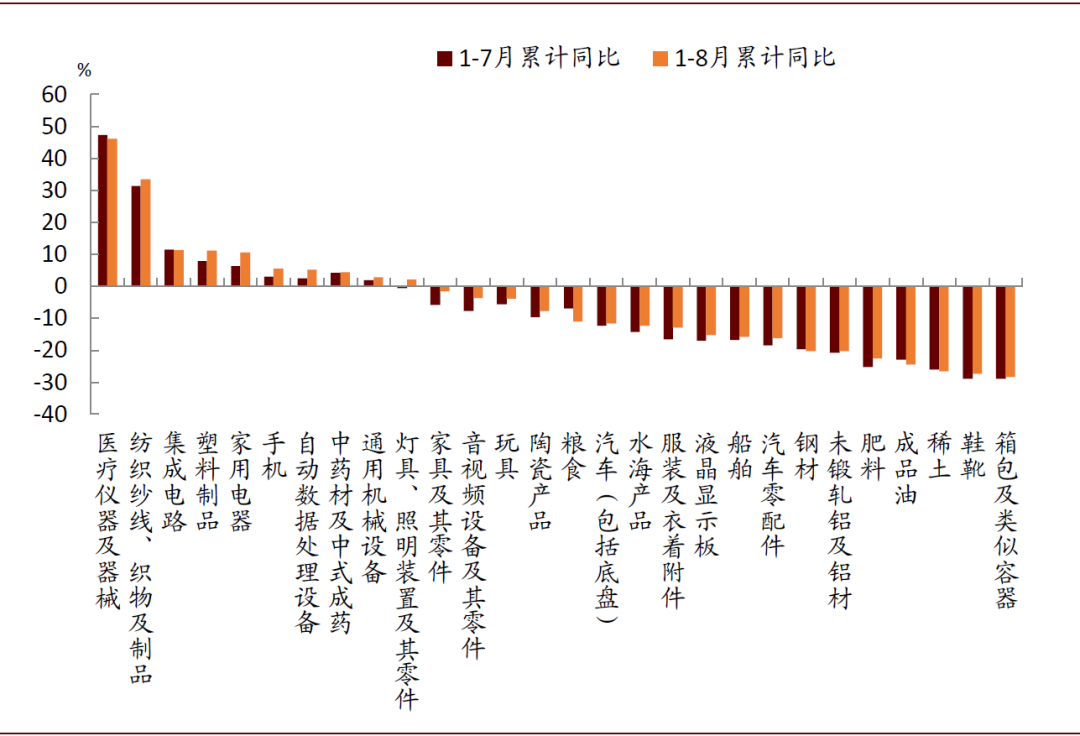 分行业看,1-8月服装和家具出口累计增速分别为-12.9%和-1.6%,较1-7月的-16.6%和-5.8%显著收窄。1-8月家电累计增长10.5%,在1-7月增长6.2%的基础上继续扩张。这些变化可能说明两点:(1)欧美居民生活正在慢慢回归正常,疫情对消费的影响逐步减弱;(2)近期美国地产行业持续升温对居家产品出口有一定的拉动作用,这一效应可能是后续出口的亮点。此外,纺织纱线和医疗器械出口继续保持强劲,说明防疫物资对出口的支撑作用仍在,短期内不会很快消失。