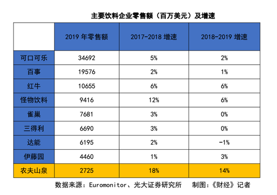 从零售额来看,农夫山泉的增速高于全球主流饮料竞争对手。