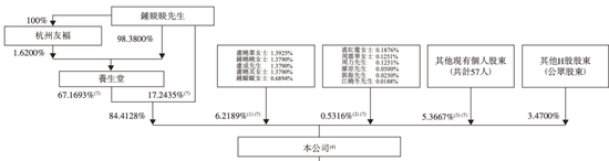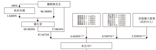 招股书显示,上市前,钟睒睒直接及间接持有农夫山泉约87.45%股权,包括17.86%直接持有的股权和透过养生堂持有的约69.58%的间接权益(钟睒睒持有养生堂100%股权,包括98.38%直接权益和透过钟睒睒全资持有的杭州友福的1.62%间接权益)。