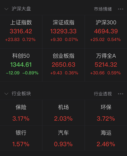 全市场表现不错,个股涨多跌少!上证指数涨0.72%收复3300点,深证成指微涨0.07%,创业板涨0.36%,两市成交额9240亿元。