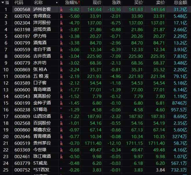而此前一直强势的消费股,近期明显走弱,今天白酒股大幅下跌,泸州老窖大跌近7%,五粮液跌逾2%,茅台跌0.7%,养元饮品跌停。