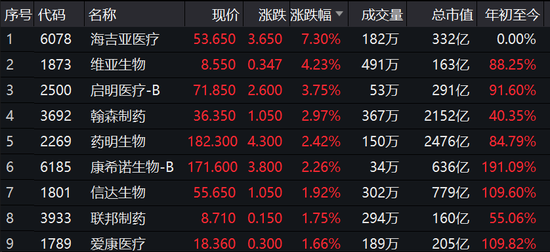 医药股有所反弹,海吉亚医疗涨7.3%,维亚生物涨4.23%,启明医疗涨4%,翰森制药、药明生物等集体涨超2%。