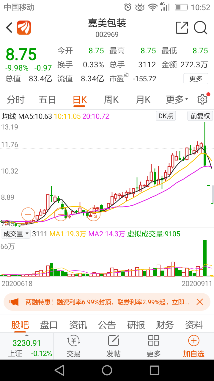 9月9日,嘉美包装上演天地板,换手率达69%,成交金额8.25亿元,全天振幅20%。