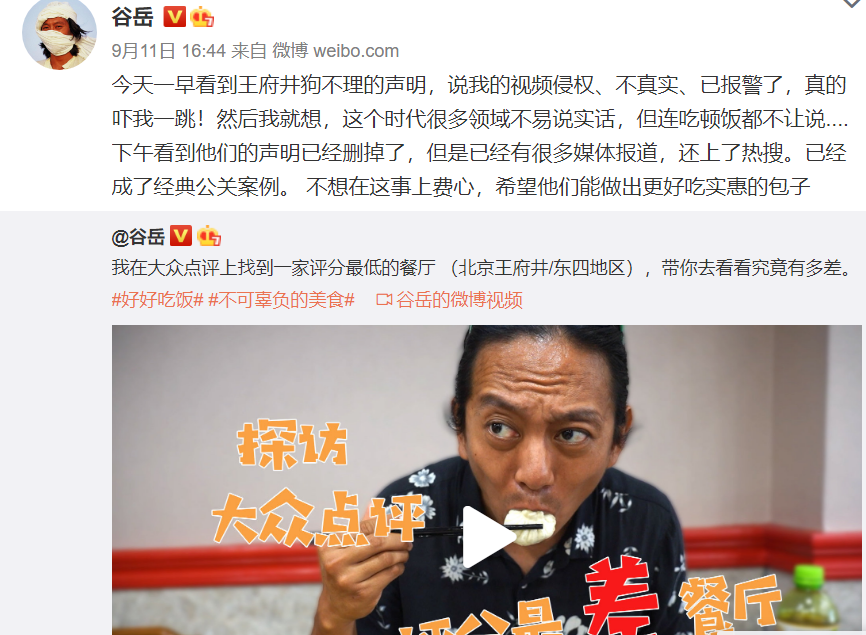 9月11日,视频拍摄者谷岳在微博上表示:
