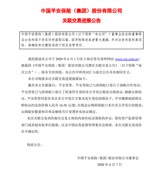 9月13日消息,中国平安发布公告称,由于目前资本市场环境的变化,经平安资管与招商蛇口友好协商,双方同意终止本次关联交易。平安资管与招商蛇口互不承担违约责任。此前双方于6月7日公告,平安资管拟16.58元/股认购招商蛇口非公开发行股份,招商蛇口拟通过非公开发行引入平安资管和平安人寿作为战略投资者并与其签署战略合作协议,平安资管接受平安人寿委托,发行完成后平安人寿将成为招商蛇口股东。