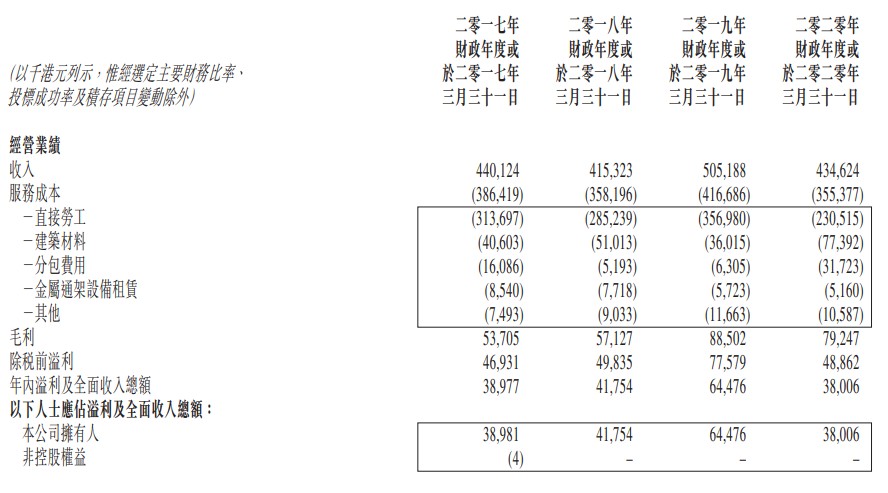 于2017年财政年度—2020年财政年度,公司自20、23、29及37个项目分别产生收入约为4.4亿港元、4.15亿港元、5.05亿港元及4.35亿港元。