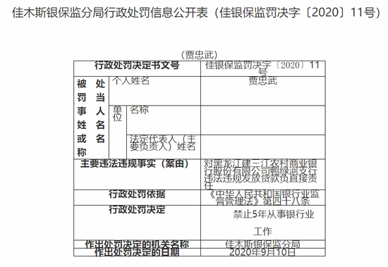 此外,相关责任人贾忠武对黑龙江建三江农村商业银行股份有限公司鸭绿河支行违法违规发放贷款负直接责任,被禁止从事银行业工作5年。