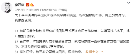 蚂蚁集团回应称,蚂蚁集团在与旷视科技合作事宜上从未与李开复先生有过接触,蚂蚁集团从未提供任何人脸数据给旷视科技。