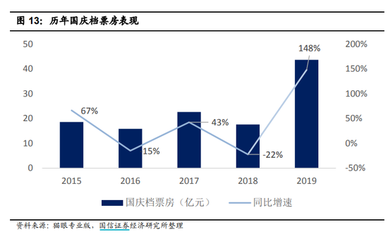 作为重要电影档期,历年国庆档票房表现对全年票房成绩有着较为重大的影响。2019年国庆档在多部大片带动之下七天累计票房达到43.71亿元(含服务费),同比增长148%,创造国庆档票房新记录。