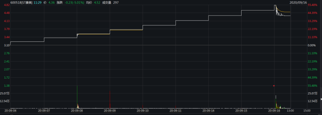 9月16日ST康美高开低走,开盘即涨停但随后股价下跌。截至午间收盘,该股股价上演“天地板”走势,跌5.01%报4.36元,半天成交额近9亿元,跌停板上的封单超过10万手,总市值217亿元。