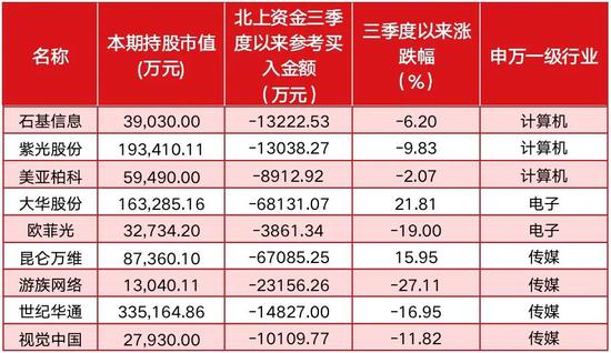 三季度以来,与北上资金接力买入的高毅邻山1号个股偏向多元化与偏消费行业不同,北上资金卖出的一些高毅重仓股则主要集中在了传媒、电子、计算机等科技行业。统计数据显示,邻山1号二季度重仓股中三季度有20只遭北上资金卖出,卖出金额合计为33亿元,其中,卖出计算机等科技股达到了约24亿元,占比超7成。三季度以来获其减仓的高毅主要科技股则整体下跌了4.1%,显著跑输同期大市。(见表2)