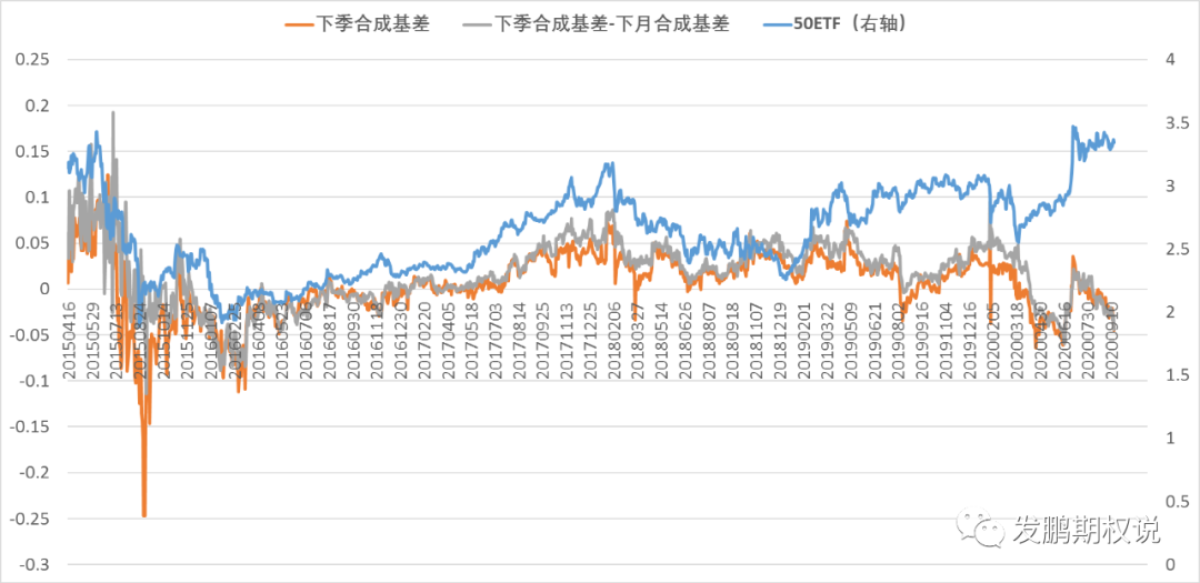 用期权或期货跨月吃贴水的方式先看上图下季合成基差-下月合成基差的走势与下季合成基差的走势基本同步即可基本了解。