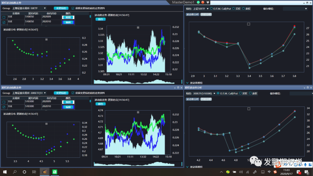 隐波日内走势与波动率曲线单日变动见咏春大师图,左侧两图蓝色、红色、绿色分别为10/12月期权隐波,背景为标的走势,上为50ETF期权、下为300ETF期权;右侧两图为当月波动率曲线图,彩色曲线为今日,淡蓝色为昨日,上为50ETF期权、下为300ETF期权。