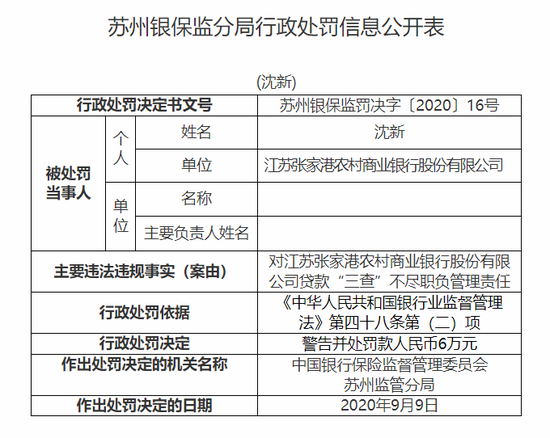 9月17日消息,苏州银保监分局公布的行政处罚信息公开表显示,江苏张家港农村商业银行股份有限公司因贷款“三查”不尽职,被处罚款40万元。