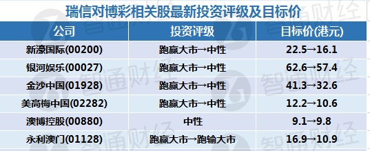 该行表示,考虑到贵宾厅业务疲弱和复苏之路波折,该行认为投资者应避开高财务负债、贵宾厅业务多,以及资产基础不灵活的博彩企业。该行下调新濠国际发展(00200)、银河娱乐(00027)、金沙中国(01928)和美高梅中国(02282)评级,由“跑赢大市”下调至“中性”,永利澳门(01128)评级则由“跑赢大市”下调至“跑输大市”,另维持澳博控股(00880)“中性”评级。该行表示,相较之下,较为看好新濠国际和银河娱乐。
