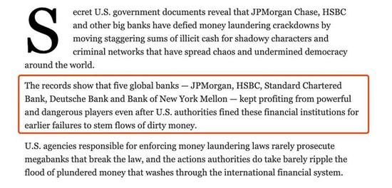 英国当地时间9月21日,由BuzzFeed和国际调查记者联合会(ICIJ)调查称,在1999年至2017年间,多家跨国银行涉嫌转移非法资金,向世界各地的高风险客户提供金融服务,规模高达2万亿美金。涉及的金融机构包括汇丰银行、渣打银行、德意志银行、摩根大通、纽约梅隆银行等。