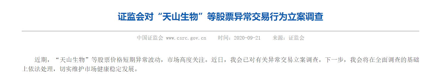 就在昨晚(9月21日),天山生物发布复牌公告之前,证监会公告称,对“天山生物”等股票异常交易行为立案调查。