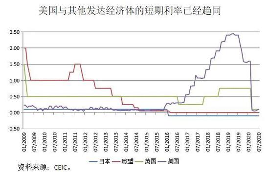 第三,美国的短期政策性利率一度跟欧元区、日本、英国的短期利率保持同步;2015年之后,随着美联储逐渐收紧货币政策,美国利率明显上升,最高的时候,跟欧元区和日本拉开了250个基点的息差。这也是美元指数能持续上升的重要原因。但在2019年以后,上述利差快速收窄,尤其是在今年美联储降息150个基点后,短期利差迅速趋于零,这也预示着美元指数即将走弱。长期利率在2018年以后也呈现出利差收窄的趋势。