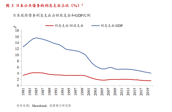 为什么会出现这样一种现象?150%的公共债务率足以引发欧债危机,250%公共债务率反而可以持续?必须找到令人信服的解释。从债务可持续性角度观察,利息支出是一个重要线索。数据显示,日本政府付息率(利息支出占名义 GDP 的比重)从2009年的1.99%降至2019年的1.53%;占财政支出的比重从5.39%降至4.24%(图3)。这说明,日本政府为公共债务所付出的利息负担是下降的,这为债务的可持续性提供了一种可信的解释。