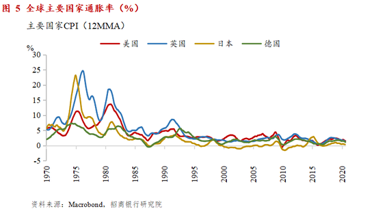 学术界首先观察到的一个现象是,过去十几年菲利普斯曲线走平,失业率与通货膨胀的负相关关系基本上已经崩溃。这让很多人舒了一口气,他们认为即使疫后就业市场修复,通胀仍可能在低位徘徊。对投资者而言,半个世纪以来,全球通胀一直处于下行通道(图5),没完没了的低通胀数据,为央行的低利率政策提供依据,市场逐渐失去了对债务累积的警觉,表现在金融市场上就是投资者对广谱风险资产的追捧。