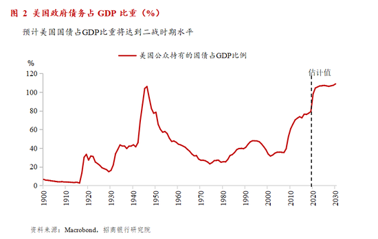回到当下,新冠肺炎疫情大流行无异于一场无形的战争,对政府债务的冲击甚于有形战争。在疫情冲击下,美国2020年财政年度赤字将到达16%,公共债务率逼近100%。国会预算委员会预计未来十年,政府债务率将持续处于甚至高于二次世界大战时期的峰值(图2)。美国的情况并非特例,疫情之下几乎所有国家的财政都面临赤字上升债务高企的窘境。欧洲各国陆续推出各种财政刺激计划之余,欧盟委员会推出了高达7500亿欧元的复苏计划。整体来看,这一轮疫情冲击下的公共债务率上升,历史罕见,相较战争时期更甚。