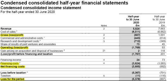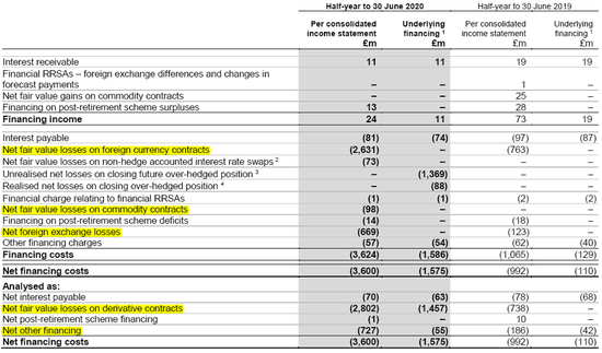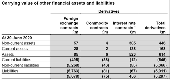 正如上图所示,净财务支出高达36亿英镑,其中最大的亏损来源于公司持有的金融衍生品——账面总额高达28亿英镑的损失。而在上半年,罗罗业务层面的毛利亏损为6.87亿英镑,即使加上4.43亿英镑的管理费用和7.12亿英镑的研发费用,总计才近18亿英镑的损失,但净财务支出这一项直接造成了相当于两倍的运营亏损额,这也是罗罗中期报表里账面54亿英镑巨额亏损的主要原因。