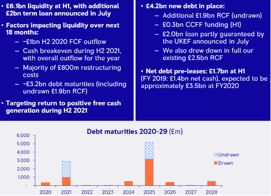 2. 大幅提高公司的资金流动性。截至目前,罗罗账面上流动性为61亿英镑,包括42亿英镑现金和19亿英镑未支取的再循环贷款。此外,还有20亿英镑的未提取期限贷款,其中部分由英国出口金融机构(UKEF)提供支持。但是,即使最乐观的预计,也要到2021年下半年才能实现自由现金流的流入,而相关的重组方案需要额外付出8亿英镑的支出,并且更为火烧眉毛的是,未来18个月内将有总计32亿英镑的债务到期。