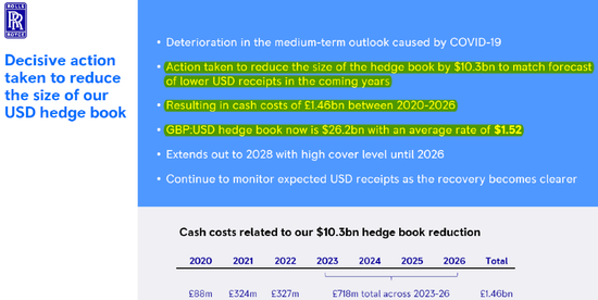 由于预测今后几年内美元收入的大幅减少,罗罗被迫缩小103亿英镑兑美元汇率衍生品的规模,为此需要在未来7年内付出总额14.6亿英镑的资本开支,但即使如此,罗罗还继续持有262亿的英镑兑美元汇率衍生品,此外,仍然保有56亿欧元兑美元汇率衍生品。除此之外,因为金融资产在当期结算时所蒙受的巨大账面损失,也严重拖累了公司的净利润表现。