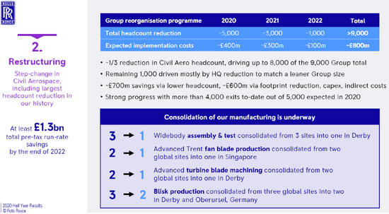 1. 重组民用航空业务,在市场需求转弱之后并且暂时缺乏新增长点的情况下,扭转亏损甚至提高收益,只有靠挖掘内部潜力,通过大规模的人力资源优化和减少资本开支来改善现金流——未来三年共计裁员9000人来节省8亿英镑的人力成本,整合各地的生产资源减少6亿英镑的资金开支。