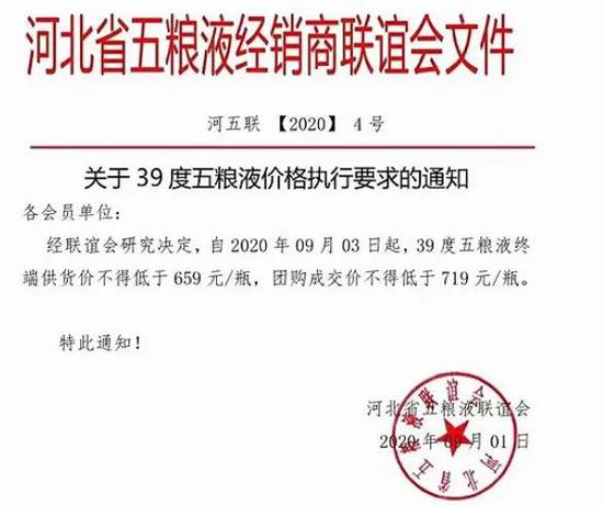 以头部名优白酒企业而言,五粮液河北、北京两地的经销商联谊会宣布,自9月3日起,39度五粮液终端供货价不得低于每瓶659元,团购价不得低于每瓶719元。