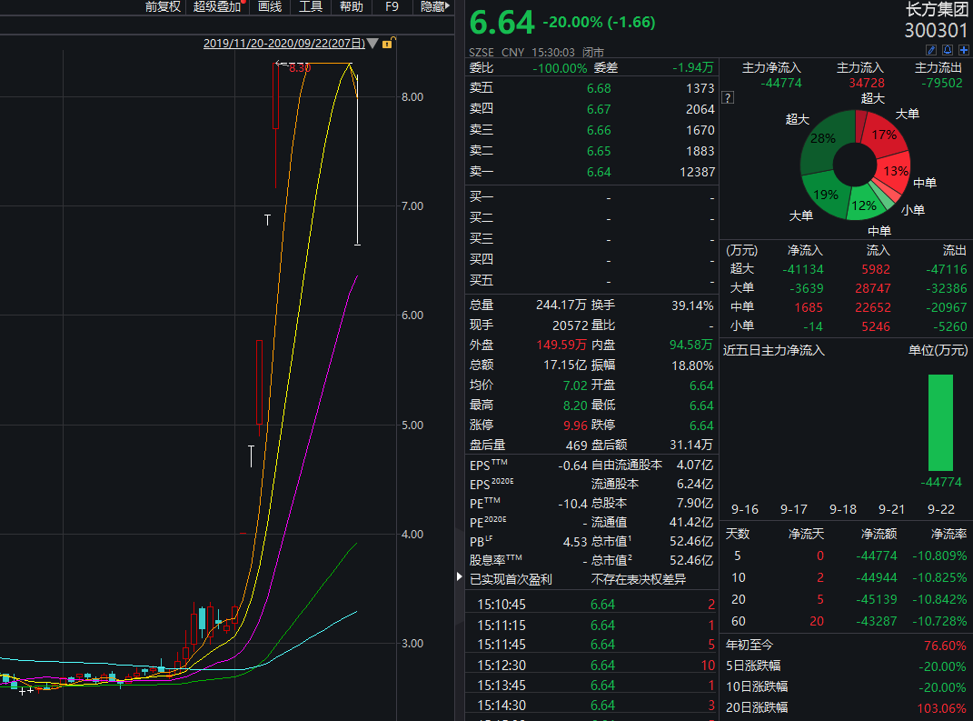 9月22日,天山生物、豫金刚石、长方集团三只股票均以跌停价开盘。上午,9点52分豫金刚石打开跌停板,股价快速拉升,长方集团、天山生物于9点54分、10点11分相继打开跌停。随后,豫金刚石拉升至翻红,最大上涨9.94%;长方集团、天山生物冲高回落。午后,豫金刚石再度上涨,尾盘回落,全日涨幅8.13%;长方集团、天山生物维持低位震荡,收盘跌停。