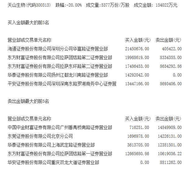 盘后数据显示,游资博弈激烈。龙虎榜数据显示,天山生物主要成交资金均来自券商营业部,其中,买一席位海通证券深圳分公司华富路买入2145万元,东方财富拉萨团结路第二营业部、东方财富拉萨东环路第二营业部买入1997万元、1749万元。卖一、卖二席位中金财富证券广州番禺桥南路、东莞证券北京分公司卖出逾1400万元。