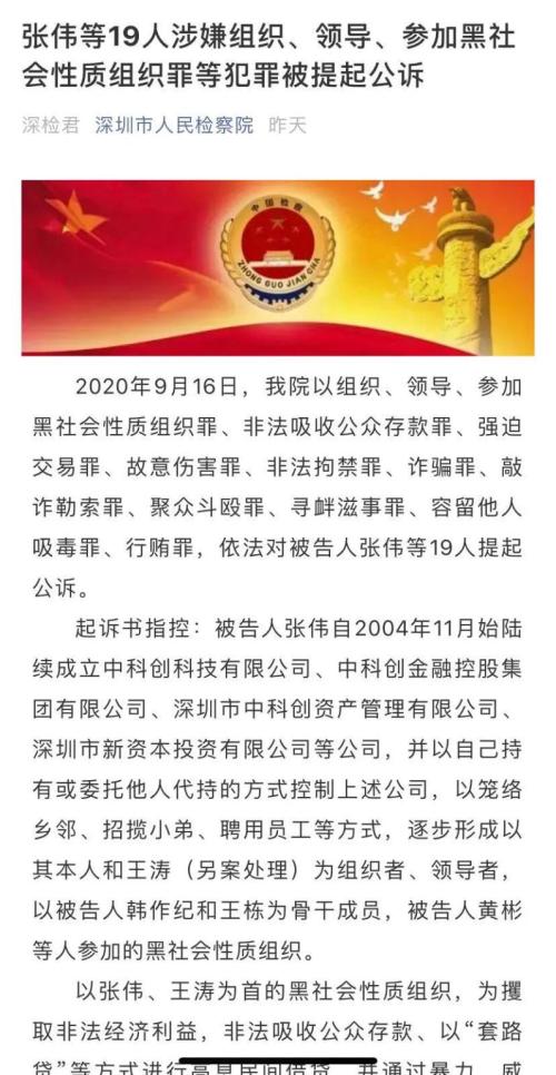 2020年9月17日晚间,ST中科创公告称,深圳市检察院对公司实际控制人张伟提起公诉。