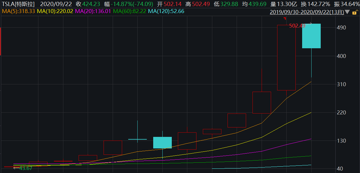 今年初,特斯拉股价为86美元飙升至最高502.49美元(除权后),8个月时间内累计涨幅高达484.29%,同期标普大盘涨幅为3.9%。