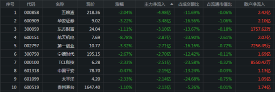 五粮液、华安证券、东方财富分别遭主力资金卖出4.98亿元、3.48亿元、3.10亿元。