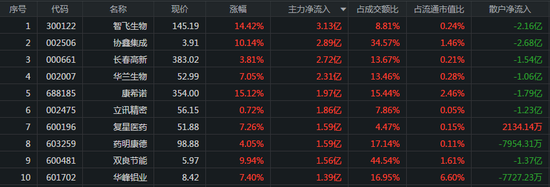 从个股来看,主力资金最青睐的3只股票分别是智飞生物、协鑫集成、长春高新,流入金额分别为3.13亿元、2.89亿元、2.72亿元,所对应的涨幅分别为14.42%、10.14%、3.81%。