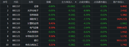 主力资金流出的板块分别是证券、光电、饮料制造,主力资金流出金额分别为26.08亿元、9.71亿元、9.10亿元,其中散户净流入金额为6.46亿元、2.41亿元、5.38元。