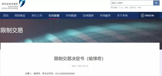 深交所最后决定,从2020年9月23日起至2020年10月7日止对喻悌奇、李连生名下的证券账户采取限制交易措施,即限制相关账户在上述期间买入在本所上市交易的所有股票。