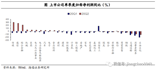 中报:大部分行业业绩改善。二季度以来经济复苏延续,从生产端来看普遍恢复不输去年,需求端随着限制措施的解除,整体保持了较快的恢复速度,随着生产需求改善,企业盈利有望得到修复,从上市A股中报数据来看,全部A股20Q2/20Q1/19Q4归母净利润累计同比为-18.2%/-24.0%/6.4%,剔除金融后为-25.1%/-52.7%/-2.3%,企业盈利降幅大幅收窄。单二季度改善比较明显的有机械、建材、汽车、电力公用事业、新能源、TMT、医药等。