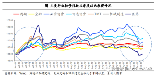就行业热点轮动来说,7月市场快速上涨,热点有所分散,转债总体来看初期金融、TMT等领涨,医药上涨迅速波动较大。7月下旬之后有所分化,此后必需消费领涨,可选消费和机械制造等表现也较好,并且可以看到行业之间的表现差异拉大。9月市场有所调整,可以看到正股估值相对较高的必需消费和医药的回调幅度最大。