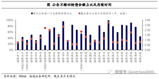 从历史上截至8月末公告不赎回转债的未转股余额和存续时间来看,超过半数存续时间在1年以内,未转股比例小于50%的有接近三分之一。但也有例如艾华转债和金禾转债,存续时间超过2年,欧派转债存续金额超过12个亿的情况。总体来看并没有一个很明确的规律。