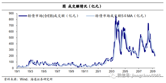 成交量波动。今年以来转债成交量放大,3月份转债市场情绪升温,成交量和波动率抬升明显,此后情绪降温。7月以来市场赚钱效应相对较好,8月部分个券热炒再现,总体成交额较6月低点有明显上升。7月日均成交量约390亿元,8月约440亿元,9月以来市场波动下成交量有所回落,指向情绪有所降温。