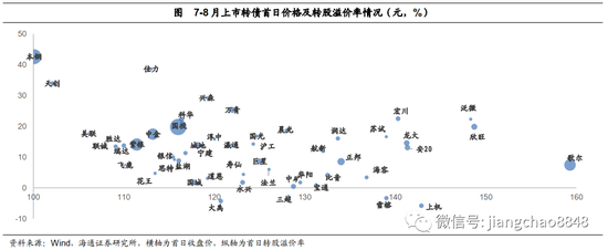上市价格分化明显。7月转债上市首日收盘平均价格约127元,创今年新高,8月整体震荡,上市首日均价有所回落。7-8月上市转债中,歌尔、欣旺等科技成长类标的,龙大、安20等消费类,以及万青等建材稀缺标的市场给予的定位相对较高,本钢等债性券吸引力较小,上市首日盘中一度破面,跌破债底。上机、大禹、雪榕等首日为负溢价。