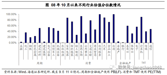 从不同行业情况来看,消费类的估值总体偏高,也是9月调整的原因之一。TMT次之,周期和金融地产较低。