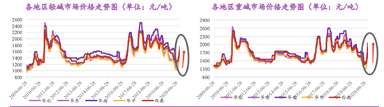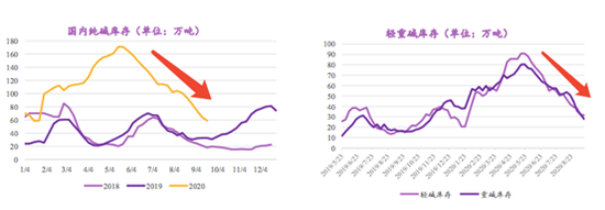 企业库存仍维持良好的去库速度,本周企业库存降至59.4万吨,周度降幅7.89%,整体去库速度较上周的12.40%放缓4.51个百分点。按照以往经验,纯碱企业库存降至70万吨以下纯碱价格才可能开启上涨通道。虽然今年纯碱价格上涨之时企业库存仍处于高位,但目前库存已降至支持纯碱价格进一步上涨的合理水平。另外需要注意的是本周重碱库存下降幅度达到13.25%,侧面反映下游平板玻璃行业对纯碱需求存在较强的刚需性支撑,且下游企业对高价纯碱接受程度也已逐步提高。