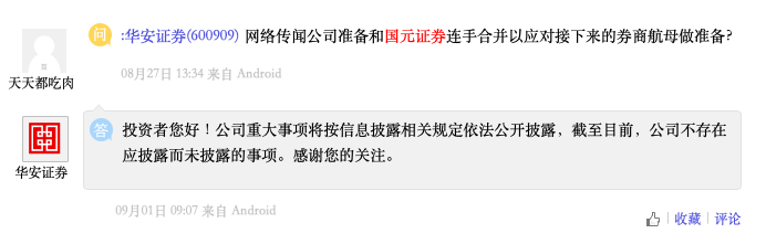 记者梳理发现,本周,国元证券(000728.SZ)、国信证券(002736.SZ)、东兴证券(601198.SH)、东吴证券(601555.SH)、华安证券(600909.SH)等均在互动平台收到投资者关于公司是否有合并计划的询问。